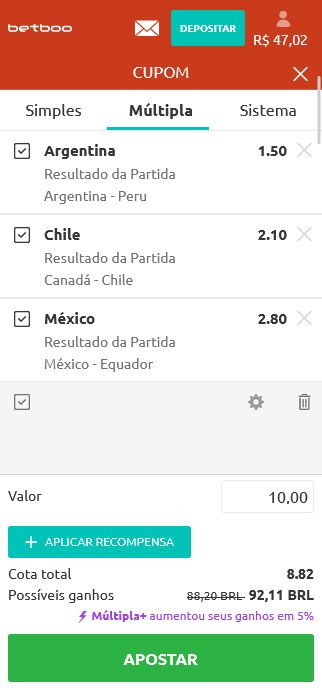 3. A Múltipla+ aparecerá indicada em seu cupom de apostas juntamente com seus possíveis ganhos. Clique em “APLICAR RECOMPENSA” para visualizar todos os detalhes e em “APOSTAR” para confirmar a sua seleção.