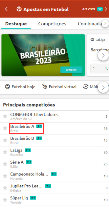 2. Uma vez na página de futebol, CLIQUE na competição em que deseja apostar. Nesse caso escolhemos BRASILEIRÃO A. O ícone de seta à direita do nome da competição tem o número 5 associado, o que significa que esta competição tem cinco Cotas Aumentadas disponíveis no momento.