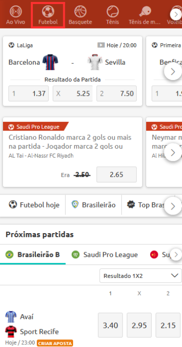 1. No topo da sua tela SELECIONE o FUTEBOL.